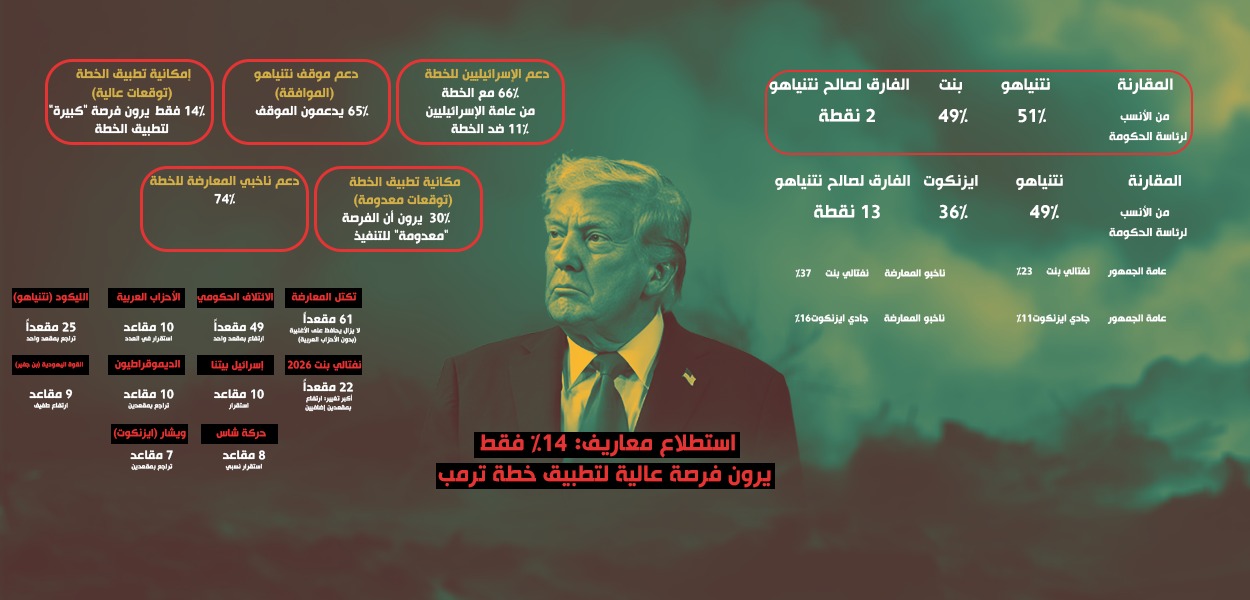 التوقعات كانت أن يترك الموقف من خطة ترمب لوقف الحرب على غزة أثرها على خارطة توزيع المقاعد حال أجريت الإسرائيلية الانتخابات اليوم، ولكن استطلاع معاريف أظهر أن للخطة والموافقة عليها من قبل نتنياهو لم تخلق تغيرات جوهرية على واقع توزيع المقاعد والذي بقي في السياق العام المتعارف في استطلاع معاريف الأسبوعي.