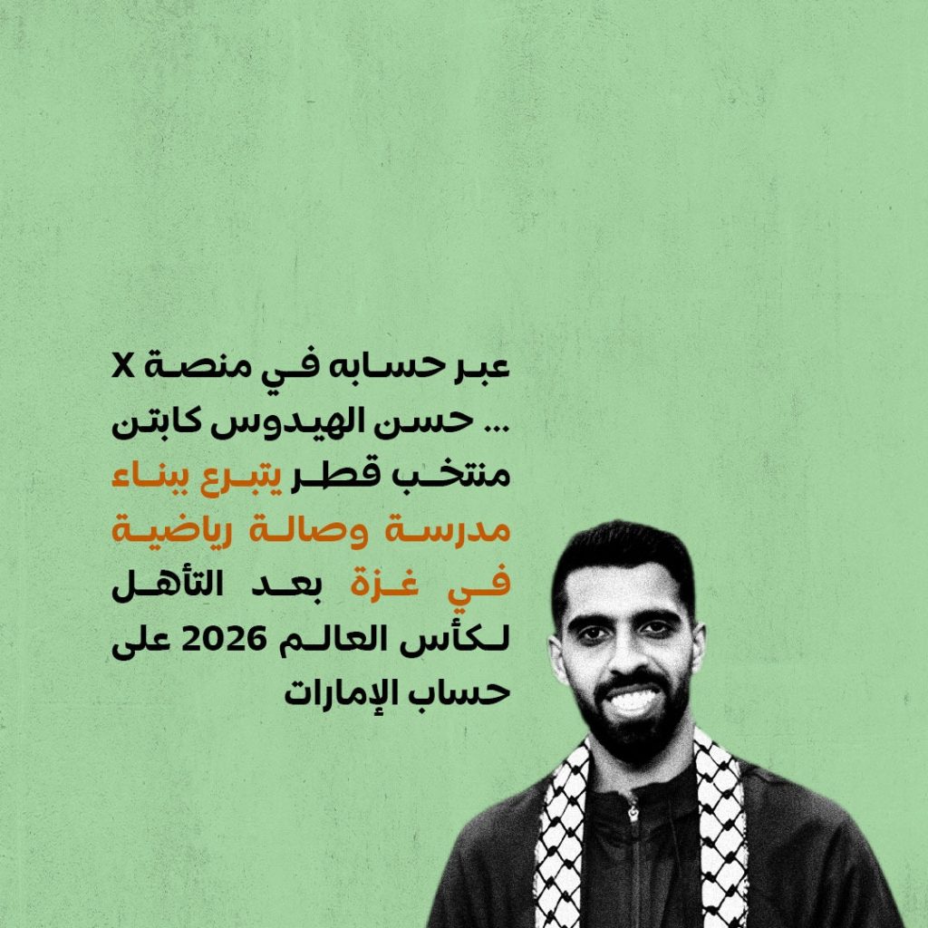 عبر حسابه في منصة X … حسن الهيدوس كابتن منتخب قطر يتبرع ببناء مدرسة وصالة رياضية في غزة بعد التأهل لكأس العالم 2026 على حساب الإمارات