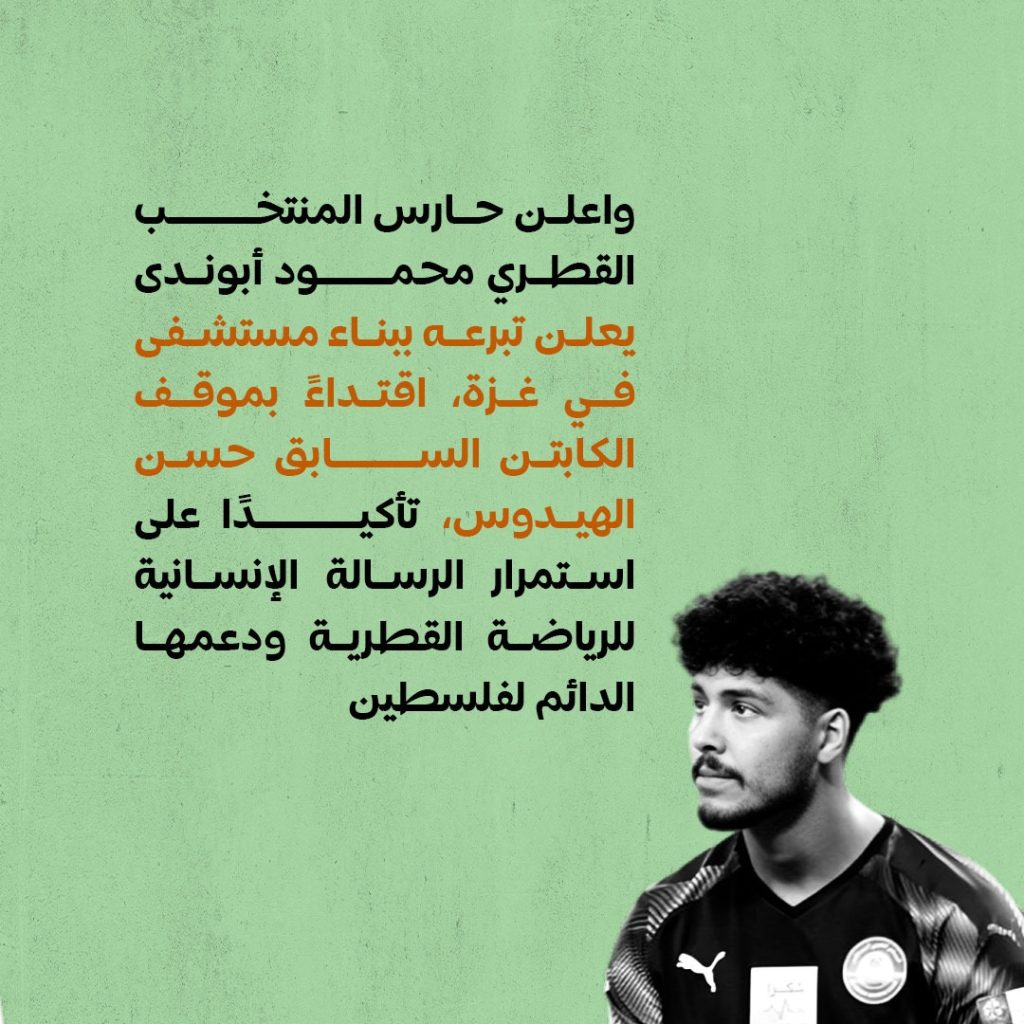 واعلن حارس المنتخب القطري محمود أبوندى يعلن تبرعه ببناء مستشفى في غزة، اقتداءً بموقف الكابتن السابق حسن الهيدوس، تأكيدًا على استمرار الرسالة الإنسانية للرياضة القطرية ودعمها الدائم لفلسطين .